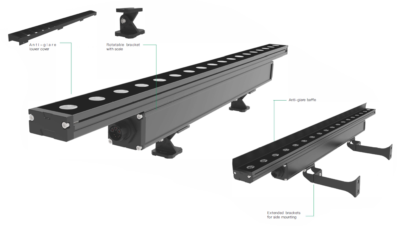 - Includes DMX waterproof outdoor rated male input connector and 30cm long female connector + 120° mounting hardware.